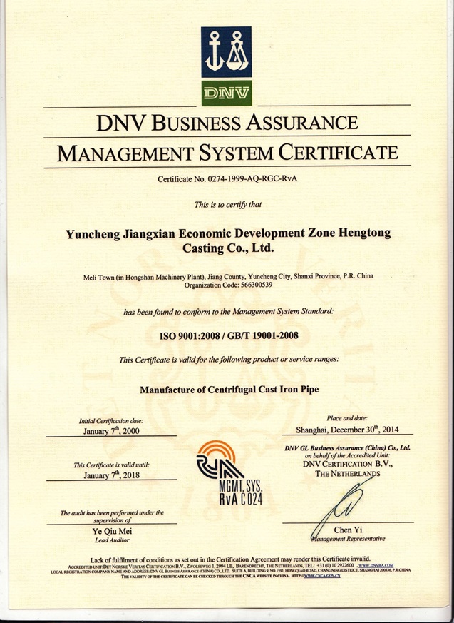 公司于2000年元月份通过了由挪威船级社主持审核的ISO9002质量体系认证,2011年又成功通过了转标换版:ISO9001:2008。产品相继通过了美国UPC、加拿大CSA、马来西亚SIRIM产品认证。现有生产能力各类标准离心铸铁管三万吨,产品质量高,企业信誉好,产品已出口美国、加拿大、德国、马来西亚等国家和地区,是曲沃县的出口利税大户。